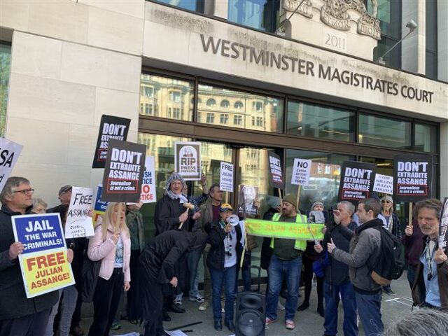 El veterano político, quien se sumó al numeroso grupo de personas que se congregaron en las afueras de la corte para exigir la liberación del fundador de WikiLeaks, recordó que Estados Unidos quiere juzgarlo por exponer los crímenes de guerra cometidos por militares norteamericanos en Iraq y Afganistán.