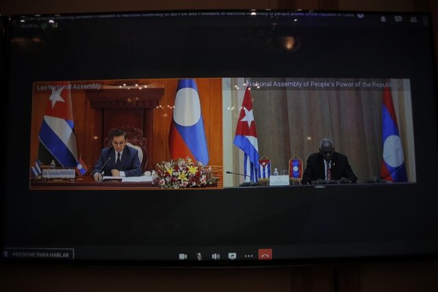 Esteban Lazo Hernández, miembro del Buró Político y presidente de la Asamblea Nacional del Poder Popular (ANPP), sostuvo hoy un encuentro virtual, desde el Capitolio de La Habana, con Xaysomphone Phomvihane, su homólogo en la República Democrática Popular Lao.