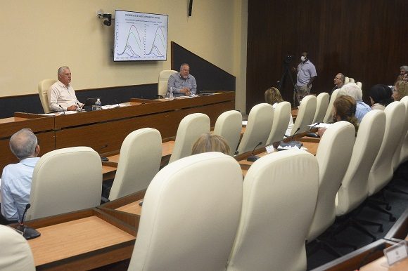 La reunión, que analiza sistemáticamente el comportamiento de un grupo de sectores y actividades vinculados de forma directa a la vida cotidiana de la población, también evaluó la epidemia de la covid-19, cuyos indicadores continúan yendo hacia una baja sostenida, muestra del control que ha logrado Cuba en el enfrentamiento a la enfermedad y la transmisión del virus.