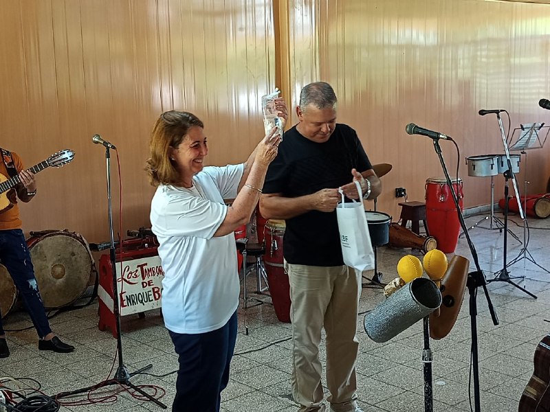 Jorge Orestes Fernández, director general de LBF, entregó a la representante del grupo empresarial suplementos vitamínicos, sales de rehidratación, dipirona y otros medicamentos elaborados en la institución, para mostrar los logros del presente año.