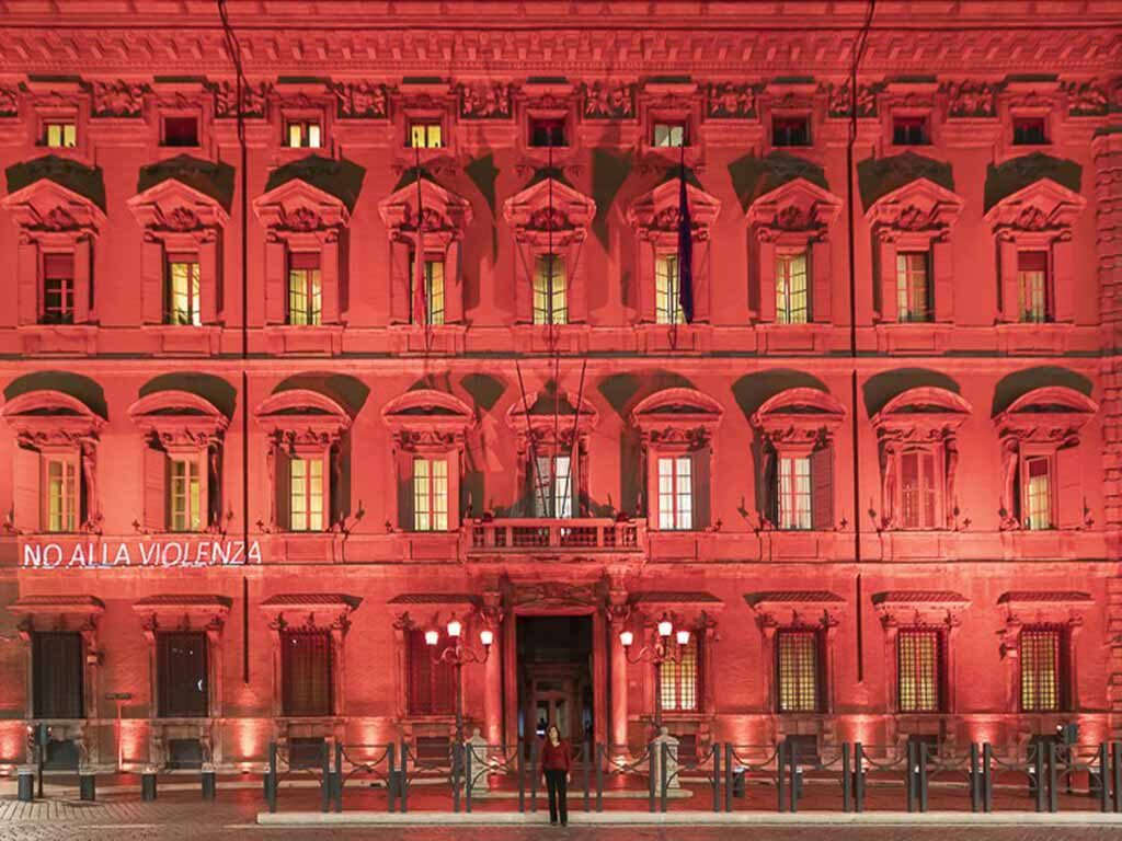 En el Día Internacional de la Eliminación de la Violencia contra la Mujer, los edificios gubernamentales se iluminan de rojo hoy en Italia, y la fachada de la sede de la Presidencia del Consejo de Ministros muestra nombres de víctimas.