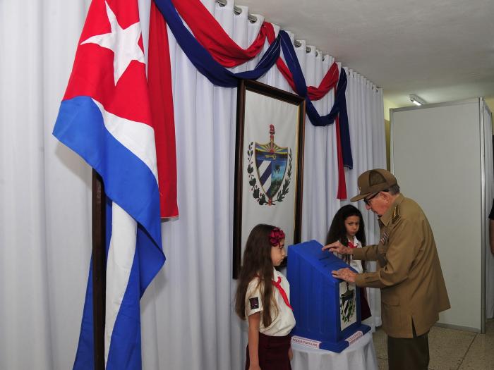 Poco después, al depositar la boleta en la urna, custodiada por dos pioneras, símbolo de transparencia del proceso eleccionario cubano, el «votó» solemne y el saludo pioneril fueron la antesala del breve diálogo de Raúl con las pequeñas.