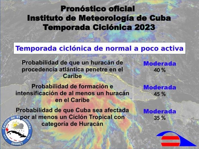 Próximo al inicio del periodo de ocurrencia de dichos fenómenos meteorológicos, del 1 de junio al 30 de noviembre, el centro científico anunció que hay un 35 por ciento (%) de probabilidad de que Cuba sea afectada por al menos un ciclón tropical con categoría de huracán.