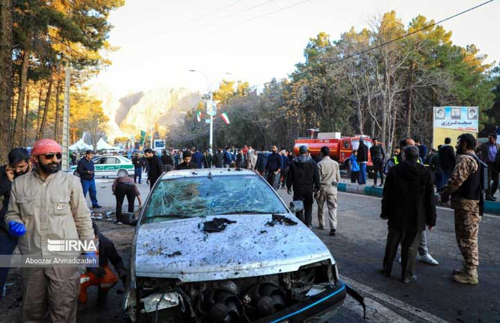 Según la televisión estatal de Irán, varias bombas de gas explotaron en la carretera que conduce al cementerio de los Mártires de Kerman, donde decenas de miles de personas marchaban para rendir homenaje al general Soleimani, comandante antiterrorista y héroe nacional, asesinado hace cuatro años en un ataque con drones de Estados Unidos en Irak.