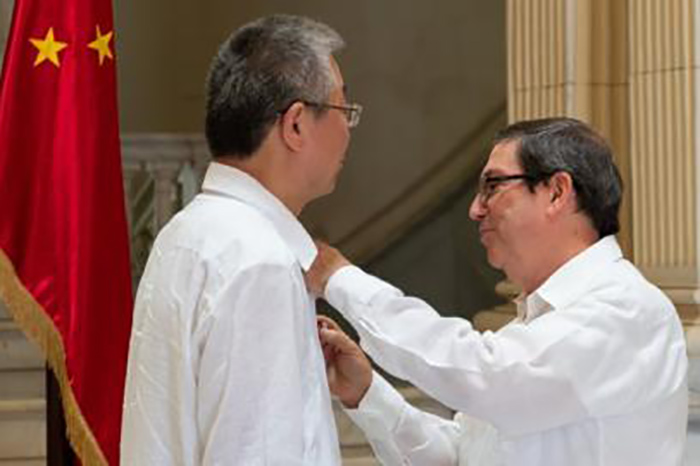 El diplomático recibió la distinción de manos de Bruno Rodríguez Parrilla, titular de Relaciones Exteriores, como reconocimiento a su contribución a los históricos e inquebrantables vínculos partidistas, intergubernamentales, de cooperación y entre los pueblos de Cuba y China, señaló el Canciller desde su cuenta en X.