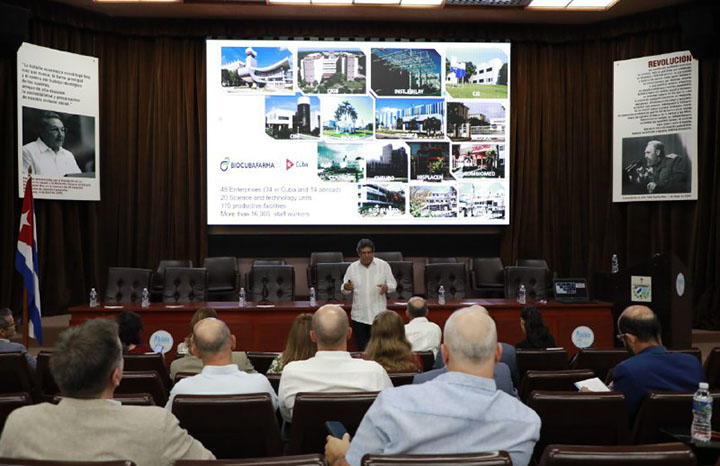 Eulogio Pimentel Vásquez, vice presidente primero de BioCubafarma, explicó la estructura de este conglomerado de la industria biotecnológica y farmacéutica con una red de 48 empresas (34 en Cuba y 14 extranjeras), 20 unidades de ciencia y tecnología y el fortalecimiento de la infraestructura productiva con más de 120 líneas de producción, tanto en la isla caribeña como en el exterior, y un personal altamente calificado.