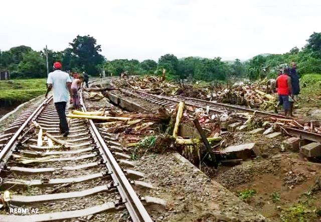 Trabajadores de la Unión de Ferrocarriles de Cuba laboran para restablecer el acceso a esta ciudad por medio de la Línea Central, interrumpido por la afectación que, en el kilómetro 833,5, provocaron las intensas lluvias asociadas a la tormenta tropical Imelda.