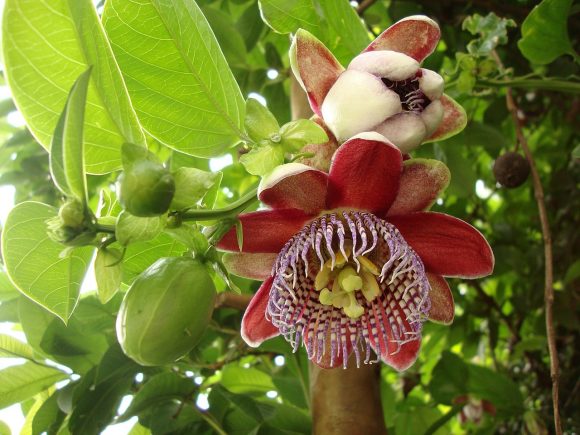 Por último, la Passiflora incarnata es una liana trepadora de rápido crecimiento, alcanza un largo de hasta nueve metros y posee unos zarcillos que le sirven para trepar. Sus flores son aromáticas, grandes y solitarias, de cinco centímetros de diámetro y de color blanco, amarillento o carnoso con tonos púrpuras. Su fruto también es comestible, pero posee muchas semillas. En algunos lugares se le conoce como flor de pasión o también maracuyá.