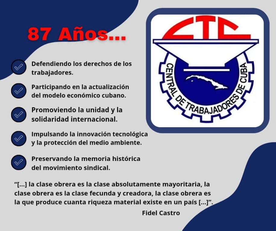 Al cumplir 87 años, la Central de Trabajadores de Cuba reafirma su esencia: es el tejido vivo que une las manos productivas de la nación, la conciencia organizada que defiende conquistas y la fuerza colectiva que sigue labrando, desde los talleres, campos y servicios, el futuro de soberanía y justicia social de la isla.