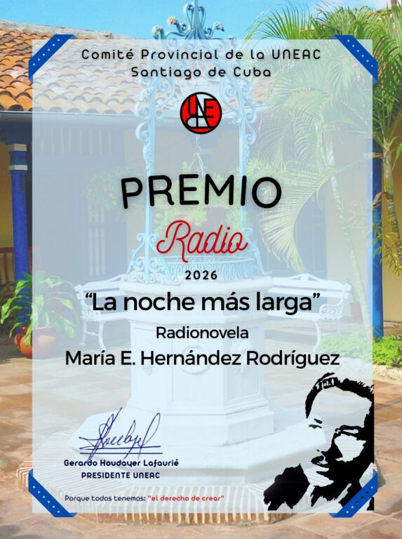 Otorgado al guión de la radionovela “La noche más larga”, de Ángel Luis Martínez Rodríguez (CMKC Radio Revolución)… Una obra que juega con el narrador múltiple, el melodrama y la memoria santiaguera, como si la radio misma se convirtiera en un archivo sonoro de la ciudad. - Premio en Radio Félix B. Caignet